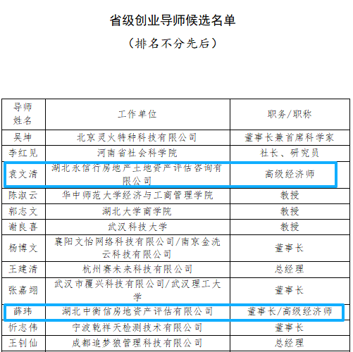 近日,湖北省人力資源和社會保障廳正式發(fā)布《關(guān)于評選省級創(chuàng)業(yè)導(dǎo)師結(jié)果的公示》。湖北永信行房地產(chǎn)土地資產(chǎn)評估咨詢有限公司董事長袁文清與湖北中衡信房地資產(chǎn)評估有限公司董事長薛瑋,憑借扎實(shí)的專業(yè)素養(yǎng)和豐富的實(shí)踐經(jīng)驗(yàn),成功入選省級創(chuàng)業(yè)導(dǎo)師。