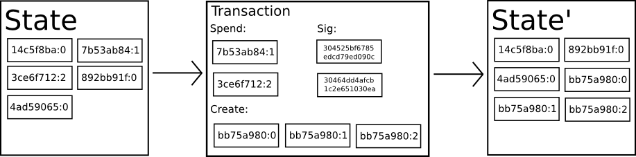比特幣系統(tǒng)的“狀態(tài)”是所有已經(jīng)被挖出的、沒有花費的比特幣(技術(shù)上稱為“未花費的交易輸出,unspent transaction outputs 或UTXO”)的集合。每個UTXO都有一個面值和所有者(由20個字節(jié)的本質(zhì)上是密碼學公鑰的地址所定義[1])。一筆交易包括一個或多個輸入和一個或多個輸出。每個輸入包含一個對現(xiàn)有UTXO的引用和由與所有者地址相對應(yīng)的私鑰創(chuàng)建的密碼學簽名。每個輸出包含一個新的加入到狀態(tài)中的UTXO。