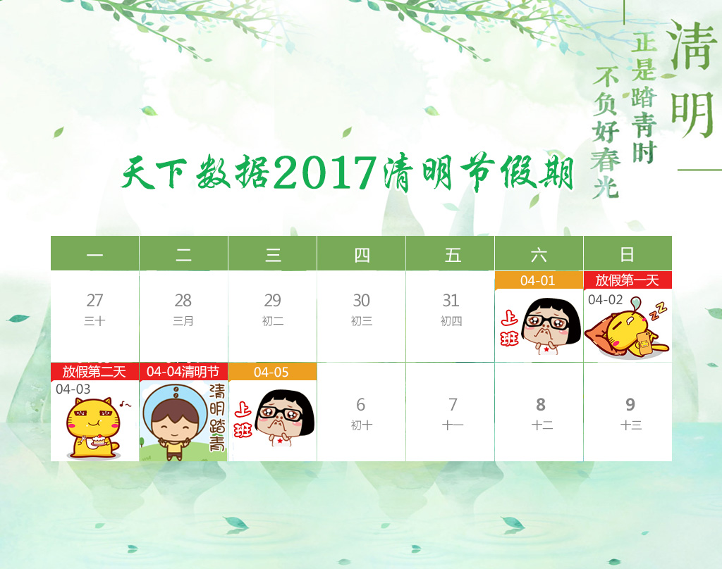 2017年4月2日-4日放假調(diào)休 , 4月1日(周六)上班,放假時(shí)間共 3天。